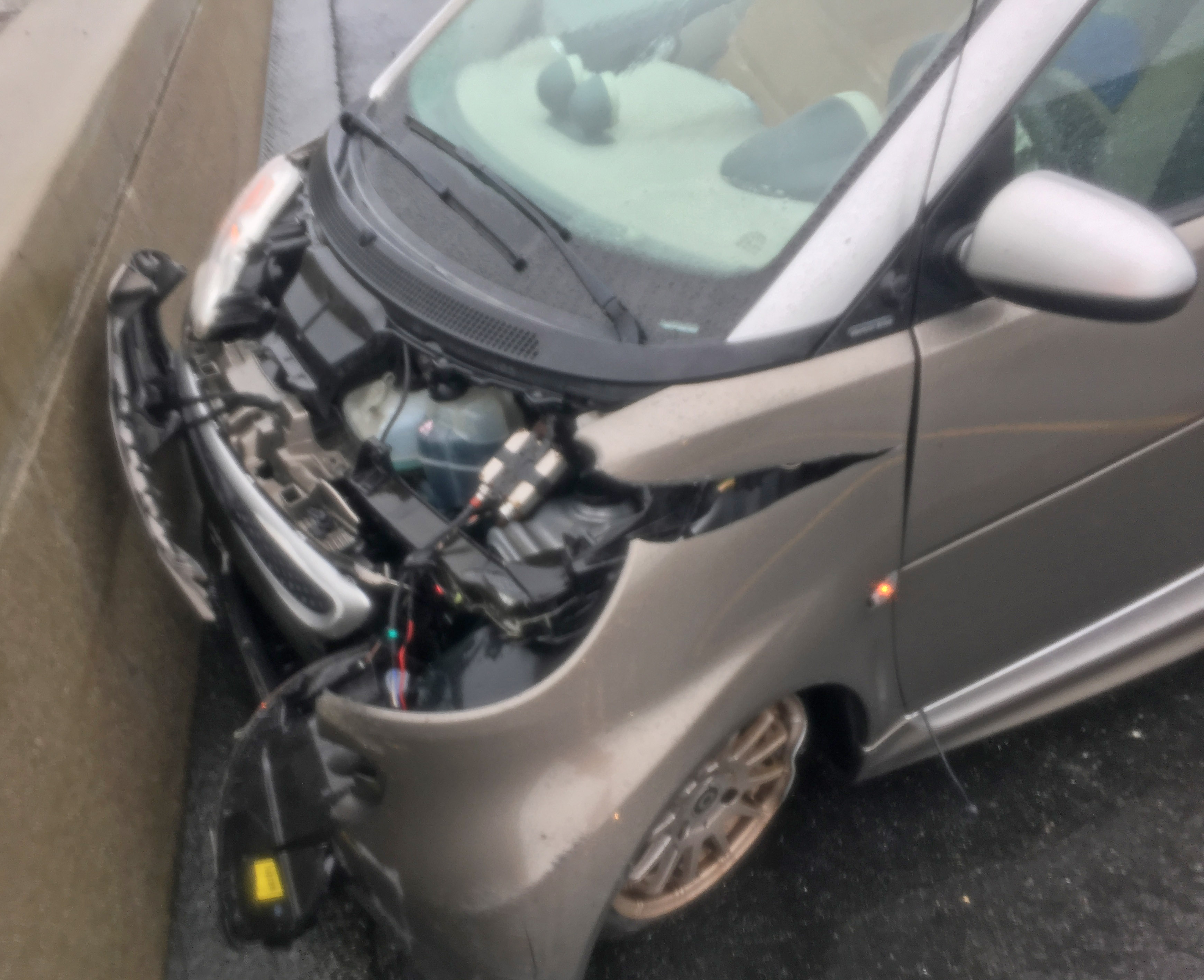 On 2/6/2017 while on my morning commute to the office my Smartcar hydroplaned and slammed into the center divide. This was on Highway 280 going north near the Farm Hill Exit in Redwood City, California.