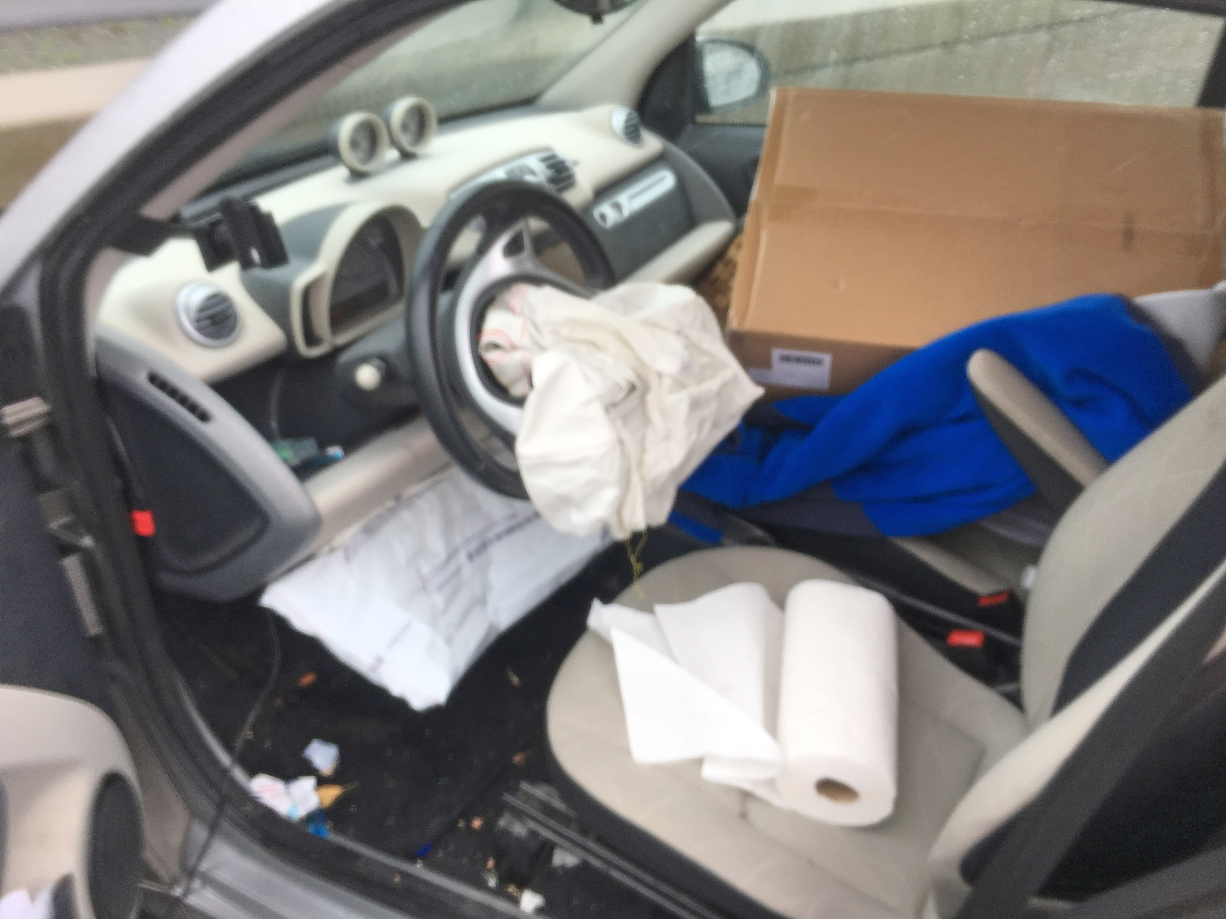 The RIGHT side of the Smartcar looks utterly un-touched. The doors open just fine, and not a single window was broken in the car.