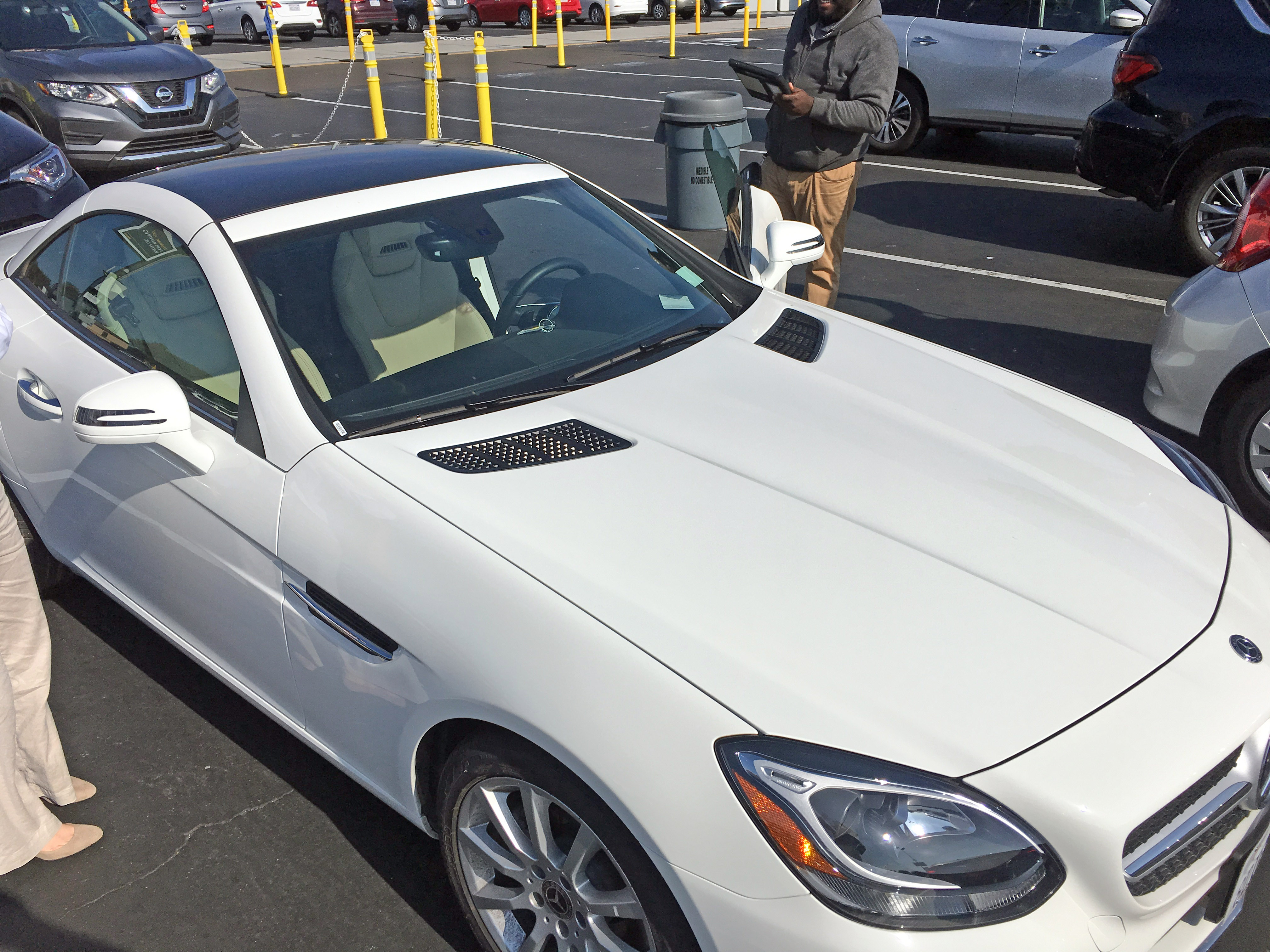 Arriving at LAX (Los Angeles Airport), we pick up our rental car, a Mercedes SLK convertible.