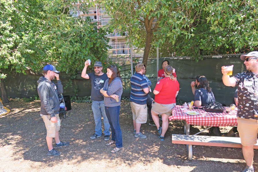 From left to right: KC2 (Casey Christensen) with hand on his eyes, Billy McCarthy, Linus Bondesson (facing away in striped shirt), Billy Ng in red Backblaze shirt in far back, Annalisa Penhollow in red shirt facing away, Rob Shaffer (?maybe?) sitting at picnic table with beard facing away, and Troy Liljedahl still toasting. :-)