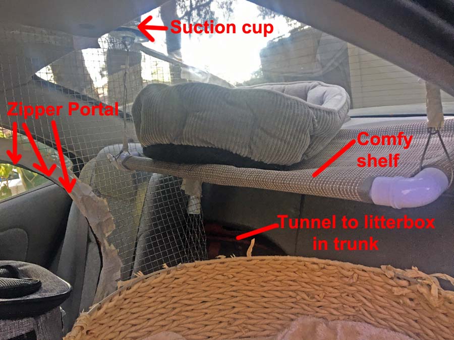 Below is a picture showing some of the "features" of the cat area. There is a "comfy shelf" with a bed. There is a tunnel to the litter box in the trunk. There is a zipper portal for Katherine to reach through and deal with the cats.