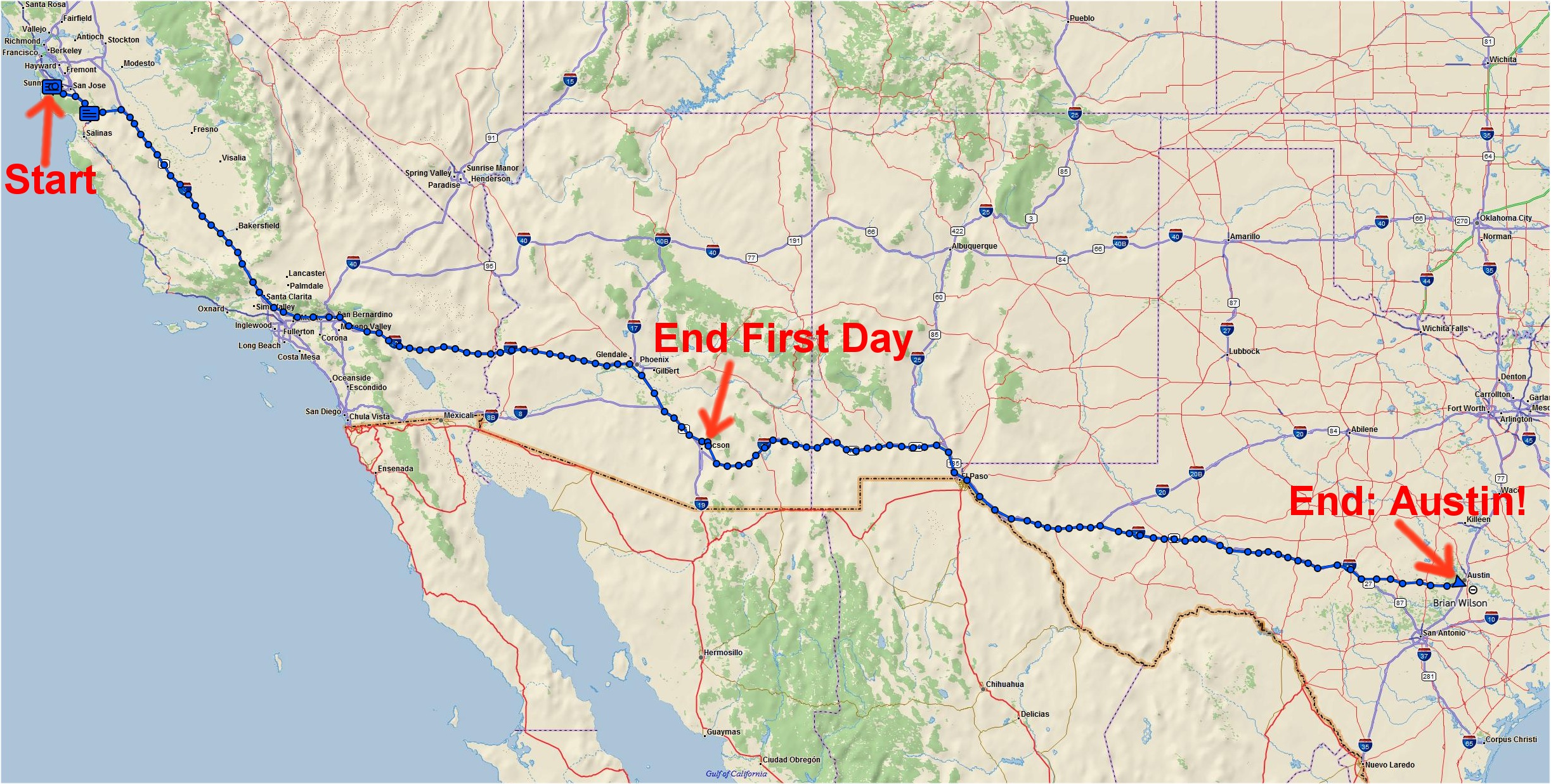 The whole trip was basically "South on Interstate 5" and then "East on Interstate 10".