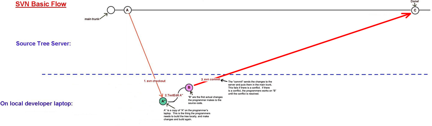 Below is the basic flow of all source code control. There is a server with the "main trunk" shared by all developers. The idea is to make a copy of the main trunk locally on a developer laptop, try out some changes and work on the code for a while, and then get the finished changes back into the "main trunk". Below is how this is done in the source code control system called "Subversion" (SVN), but it is pretty much the same in Perforce, CVS, and a number of other source code control systems I have used. Time flows from left to right. Click on any image below for a bigger version: