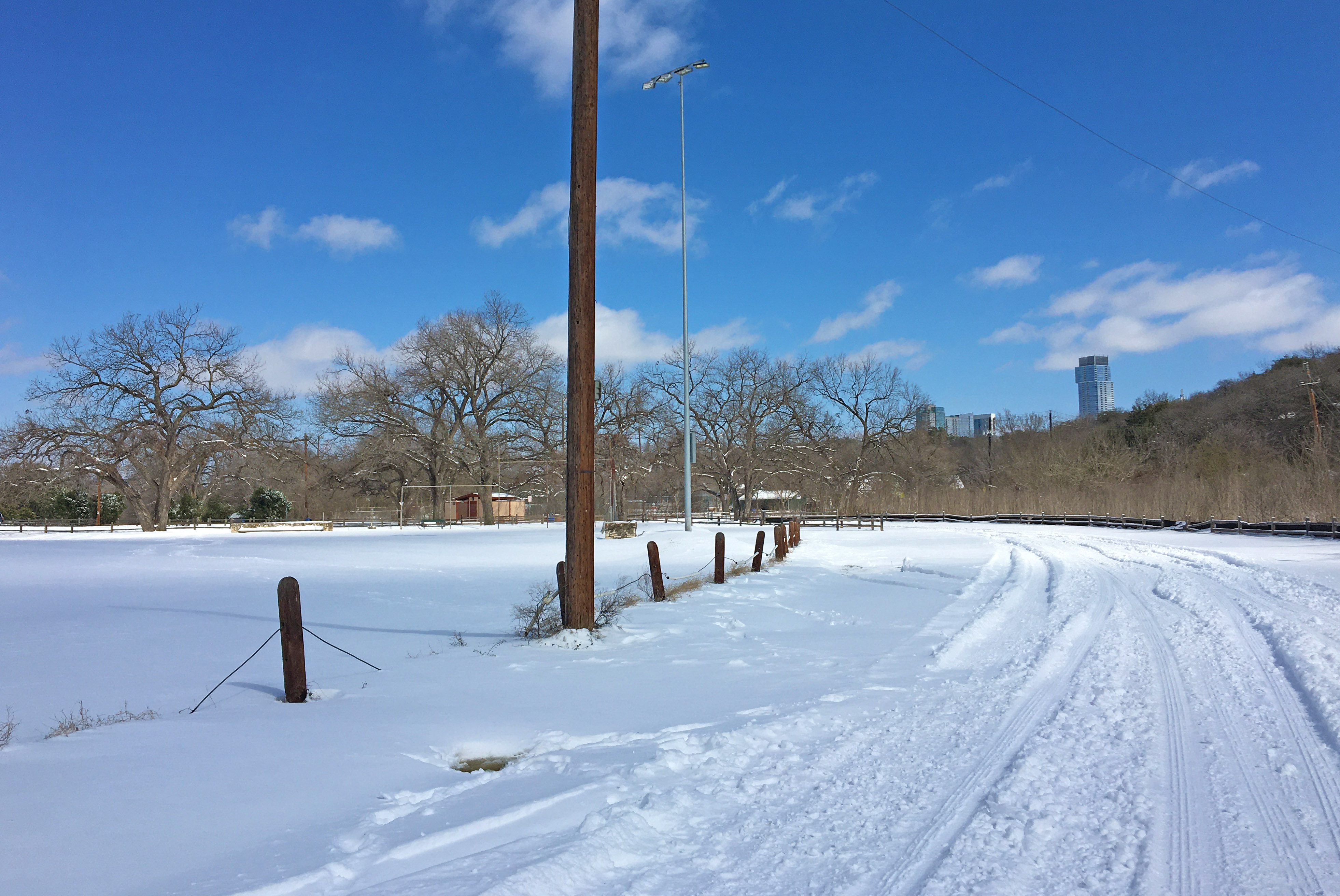 Below is a picture taken of snow in Zilker Park in Austin Texas, you can see downtown Austin sky scrapers in the distance.