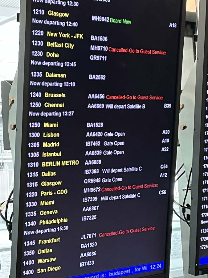 A flight board showing how a ton of flights are cancelled. This is why they couldn't assign us a seat on British Airways 2 days ago, or yesterday, or today as we left Austin. There was no seat, they were just liars.