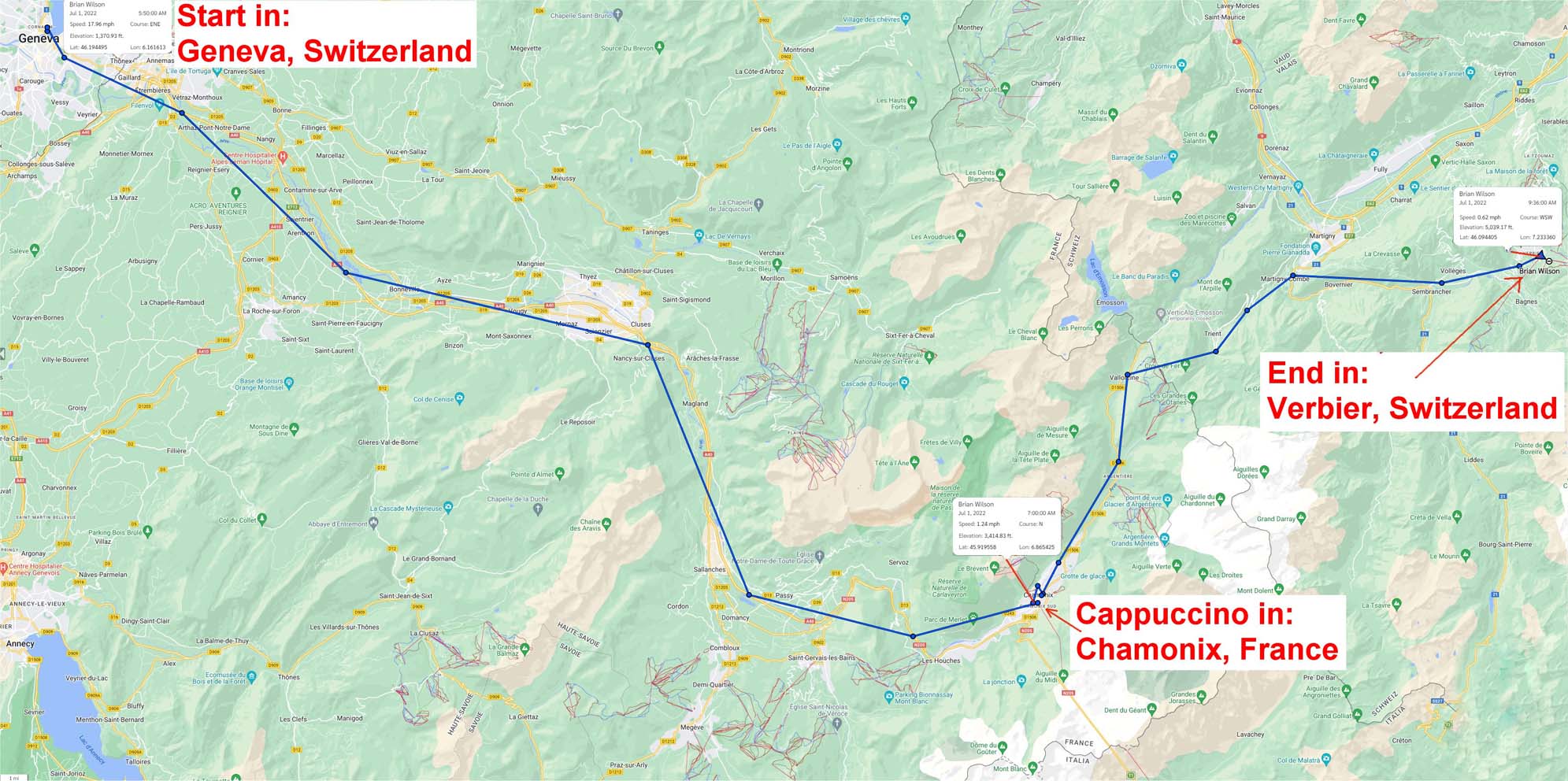 So this first day we drove from our hotel in Geneva, Switzerland to Ed Bugnion's ski chalet in Verbier, Switzerland, passing through Chamonix France on the way. Below is how the Garmin InReach website looks tracking us in "real time" (every 10 minutes it uploads a waypoint). Ed could track our progress by a URL: https://share.garmin.com/brianwski