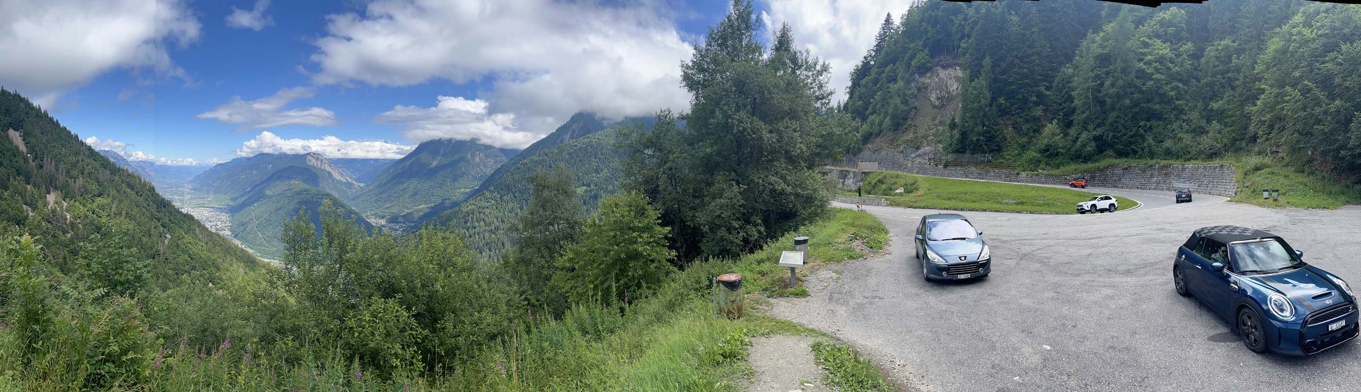 The picture below can be found here: https://goo.gl/maps/Y6SURziBiXTR4jv96 and the town in the valley below is Martigny, Switzerland. I love these roads and this region of the world, it's very beautiful here. I have stood at this same spot and taken several photos like this one over the years.