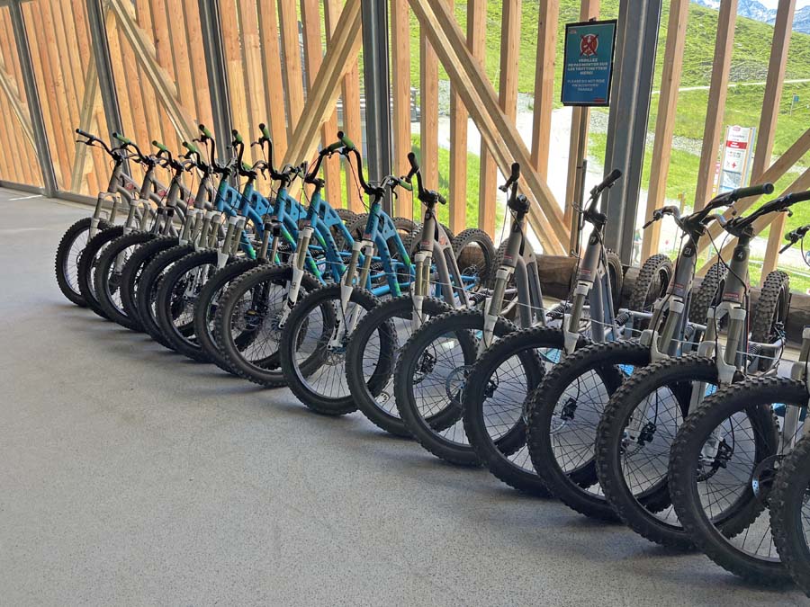 A row of this type of "downhill coasting standing bicycle" for rent:
