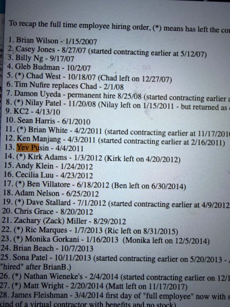 The early list of employees at Backblaze (and dates) is in the screenshot below, but you can find the full text list on the Backblaze Timeline.