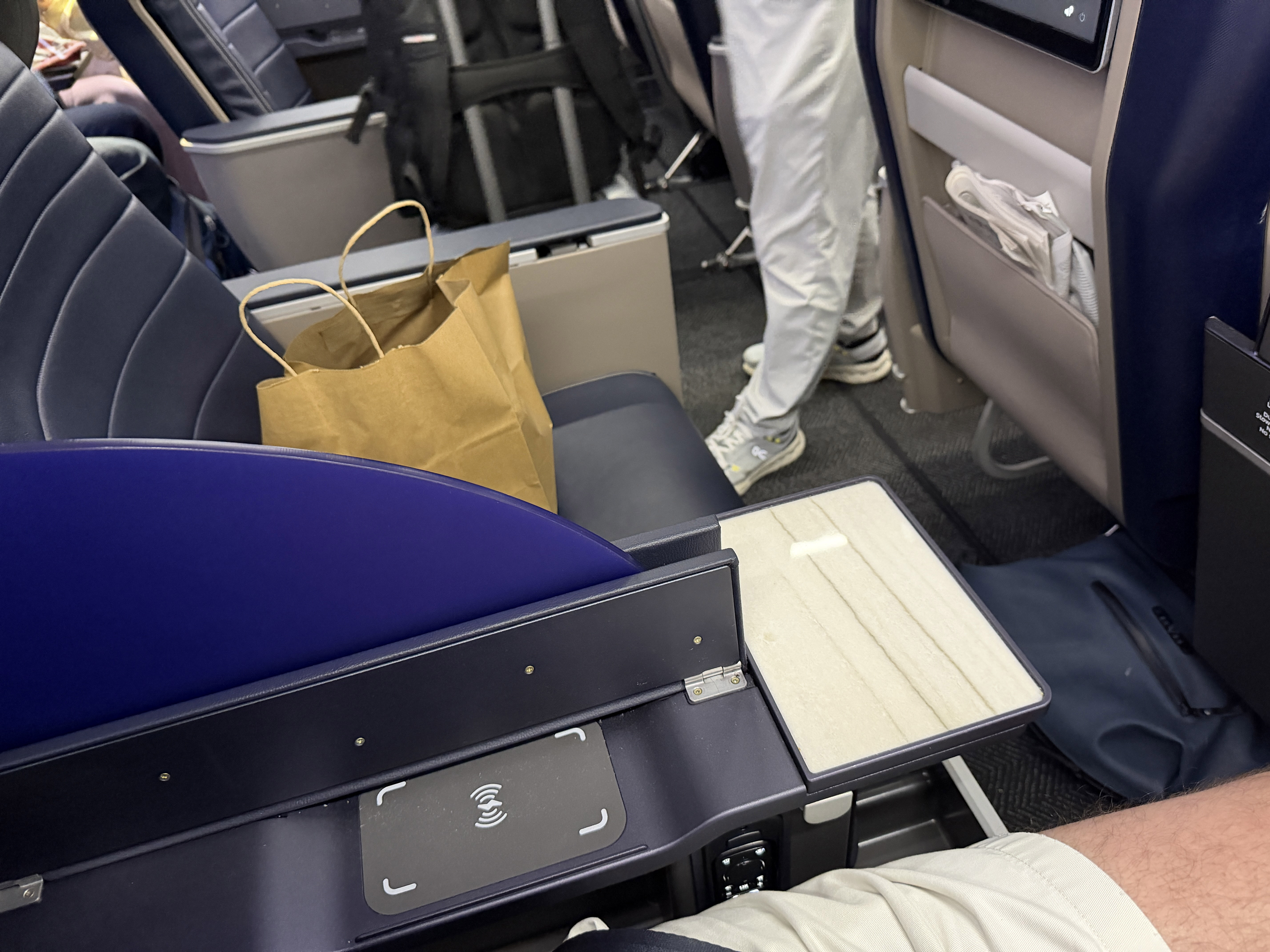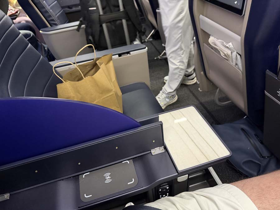 My United flight home seemed to be in a newly outfitted airplane. It was very nice. In the picture below, the "lid" on the armrest is raised to show where you can place your phone to recharge it. There is enough space so you can close the "lid", use the armrest, and the phone cannot slide out due to a nice, well designed lip. I was impressed. This is the first inductive charger in an airplane I found actually useful and well designed.