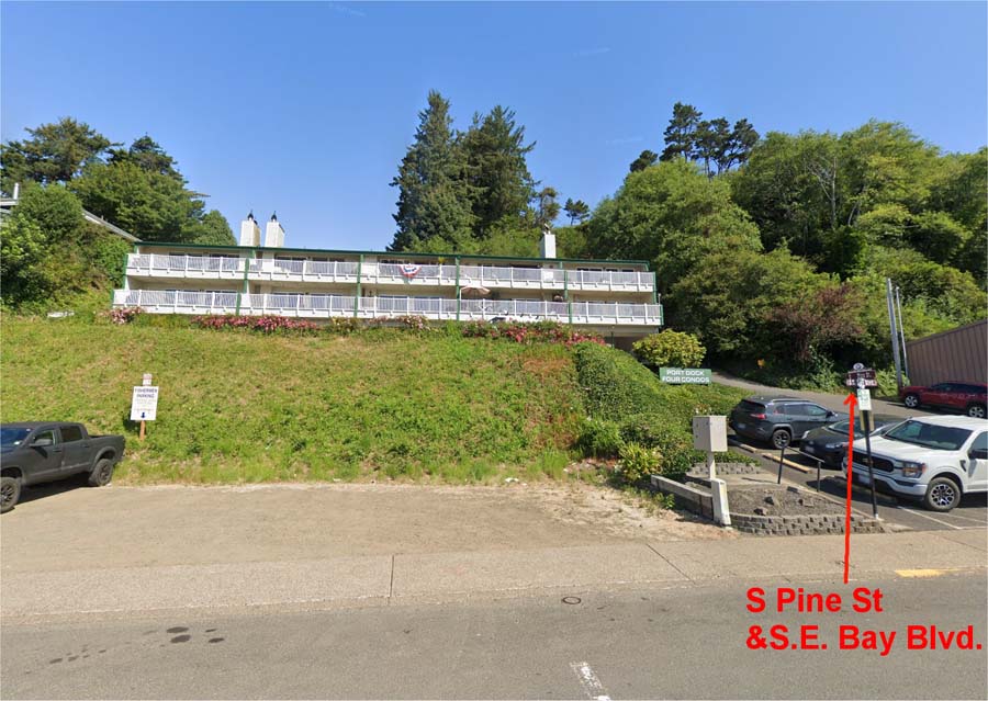 We met up with Karl, Tam, and Brady at Karl/Tam's condo which is at 1306 S Pine St, Newport, Oregon. Picture below of their condo in Newport. What the REVERSE direction shows is views of the Newport Harbor, the docks with boats, and sea lions (hanging out on the docks). Click on the address link earlier in this paragraph to use Google Streetview to look around.