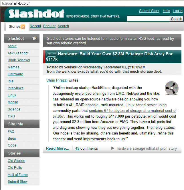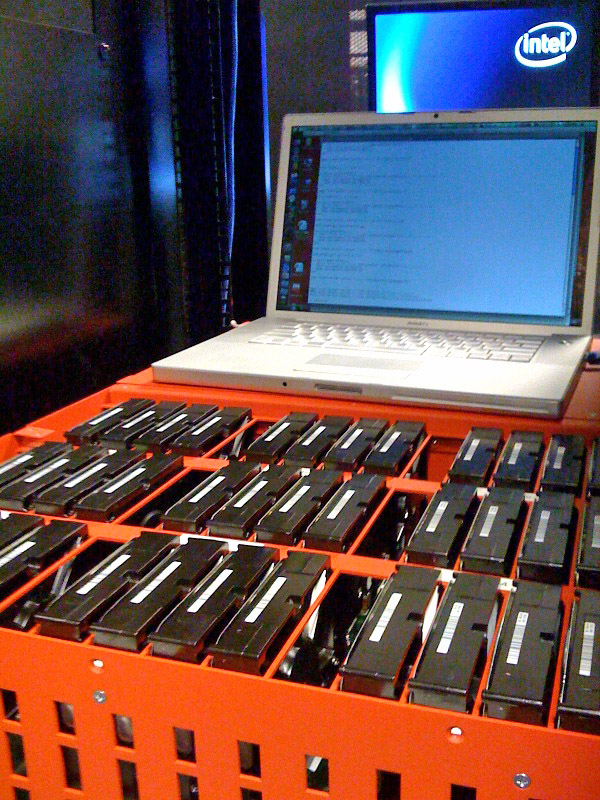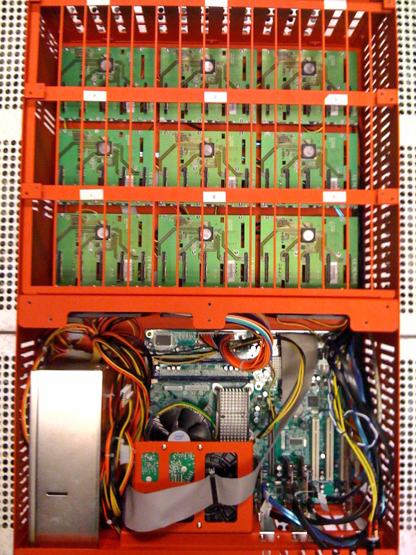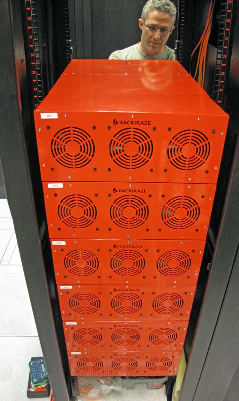 10/10/08 - Friday - Tim brings up 45 one terabyte drives all attached to a single CPU using eSata and port multiplier cards. This will be the basis of our future "best pod" design. We got around 44 Mbytes/sec read and write under full load in this config which is running Debian Linux and software RAID 6 on the JFS file system. The CPU is a Intel core-2 duo 2.53 GHz. The 45 drives are organized into 3 RAID groups of 15 drives each. The 15 drives are configured with RAID 6 where they can lose any 2 drives and not lose data in that RAID group. In the prototype (pictured below) we are still using external drive cabinets, but the technology is all the same as will fit into a 4U rack slot in a datacenter.