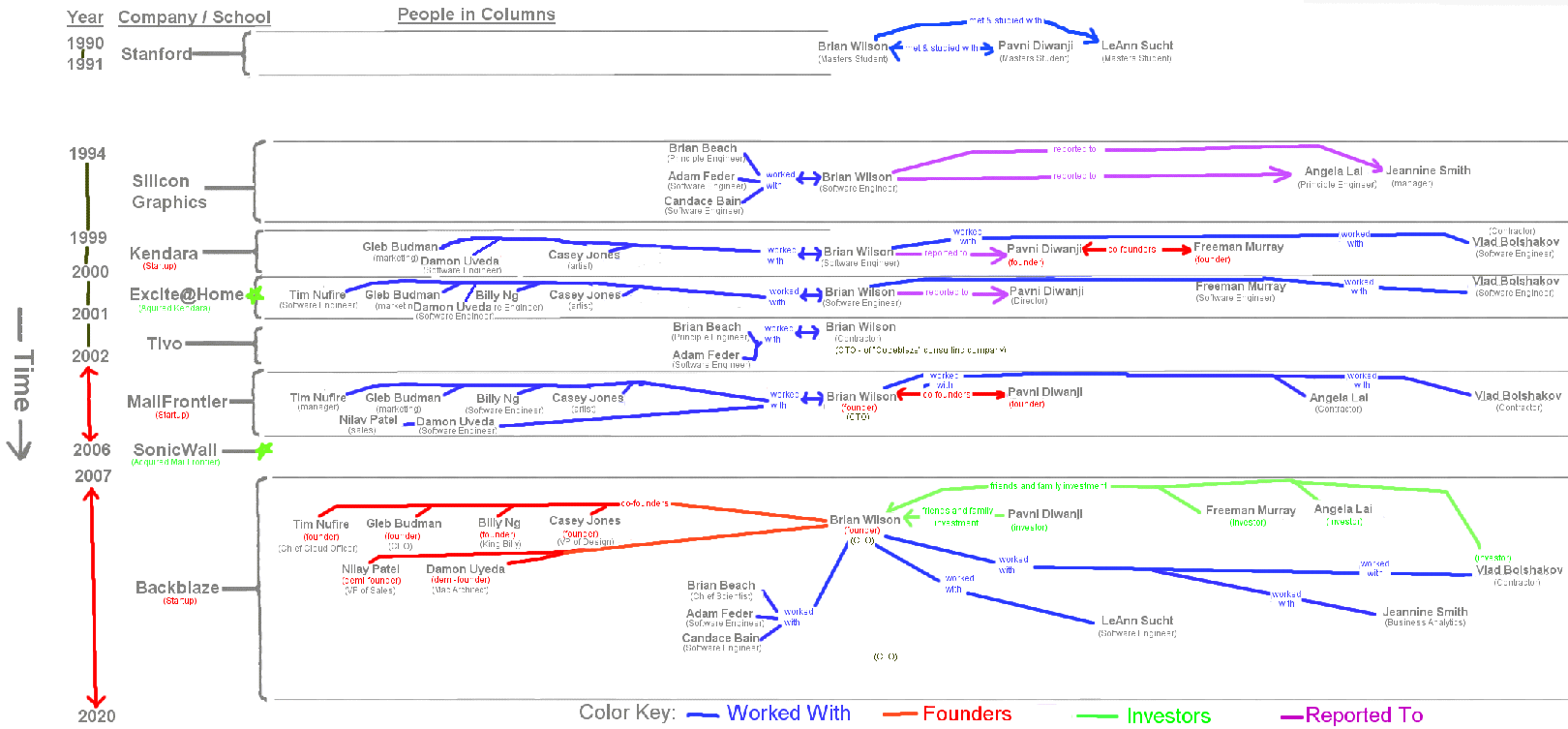 The diagram below I created in 2020, but I want to show it here to show where this team came from. Click on the diagram below to see a larger version. It's complicated, but individual PEOPLE are in columns (like Brian Wilson appears in the center column and does not appear in other columns), and the years are shown in the Y-Axis as time goes by. This is how we know each other:
