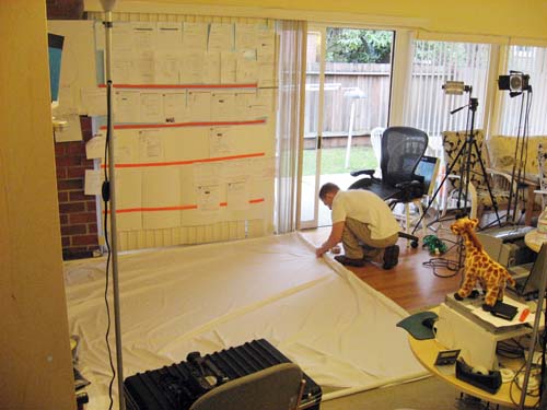 1/9/08 - Wednesday - As a result of the previous day's tests, we decided we needed a "green screen" background that was larger, so Casey hung a white sheet from Target over the back of a PVC pipe frame. Below shows Casey taping the white sheet on the ground.
