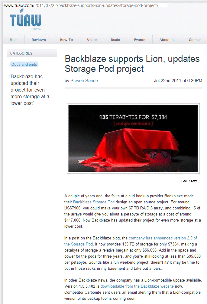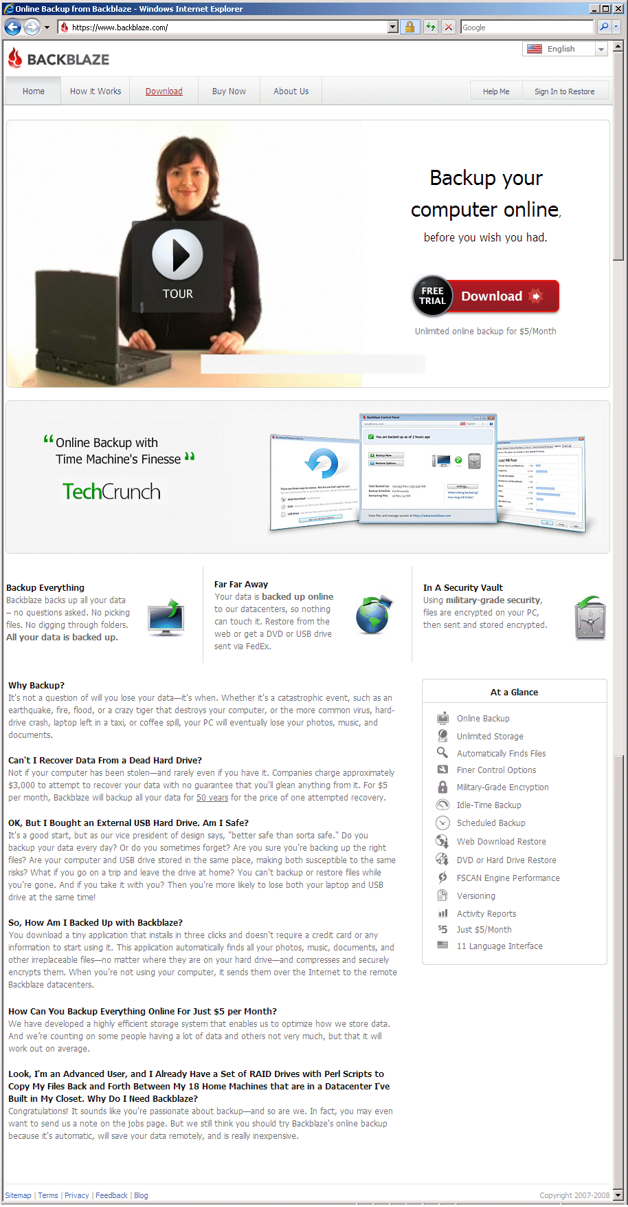 6/2/08 - Monday - LAUNCH! Backblaze launches "public beta" with version 1.0.0.71. This product is feature complete and is launched, the only reason it still says "public beta" is Gleb wants to try to parlay taking the "beta" status off of the product into future press articles. At this point all of the Backblaze expenses add up to $94,122.40 to get to a revenue generating, publically launched software product. The expenses do not include the donated time of the 5 founders for a year, the expenses are all for computers, hard drives, desks, printers, paper, etc, and a FEW small marketing expenses like a press release for $300. Click one of these to read articles about the launch: TechCrunch, ArsTechnica, SimpleHelp, KillerStartups.