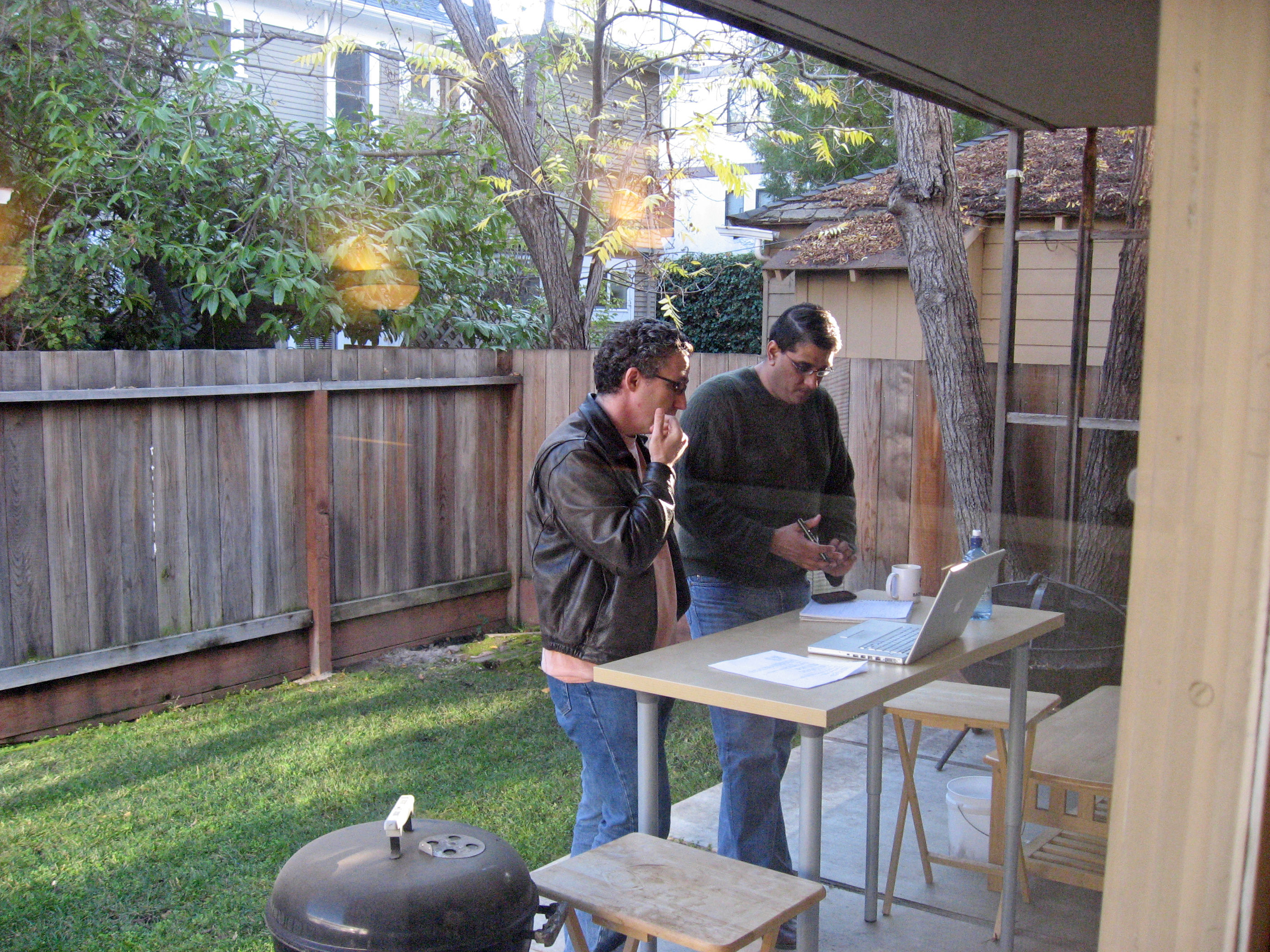 10/23/07 - Wednesday - A picture of all five partners (camera on timer) figuring out what we want to build. The formulating idea of this day was "online backup, focused around 'pro-sumer' family backup". About here was when we moved to "PLAN B": 1) Backup to Backblaze Datacenter only. No Peer-to-Peer.
