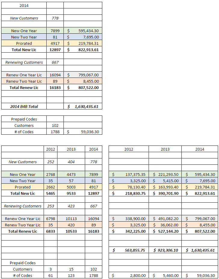 Total User Accounts ever created: 662,614 + 644,787 + 548,035 + 31,545 + 35,775 = 1,922,756 Total HGUIDs ever created: 1,267,676 + 1,430,806 + 819,143 + 68,758 + 10,506 = 3,596,889 Number HGUIDs deleted: 797,421 + 916,254 + 305,897 + 11,115 + 349 = 2,031,036 Unique HGUIDs Calling Home in last 24 days: 195,568 + 204,204 + 182,113 + 6,469 + 4,419 = 592,773 month_to_month_hguids: (53,553 + 66,407 + 43,381 + 1,181 + 334) * $7 = $1,153,992 per month month_to_month_unused_licenses: (218 + 197 + 305 + 11 + 80) * $7 = $ 5,677 per month includes >3month PrpaidC-> one_year_hguids: (124,593 + 145,916 + 106,705 + 2,285 + 719) * $70/12 = $2,217,938 per month one_year_unused_licenses: (3,012 + 2,925 + 3,036 + 24 + 31) * $70/12 = $ 52,663 per month two_year_hguids: (43,974 + 56,962 + 36,258 + 966 + 219) * $130/24 = $ 749,553 per month two_year_unused_licenses: (1,504 + 862 + 1,335 + 26 + 16) * $130/24 = $ 20,275 per month ------------------------------------------------------ -------------------- Total: 697,035 paid licenses $4,200,090 per month (Extended Version History is an additional $169,000 per month)