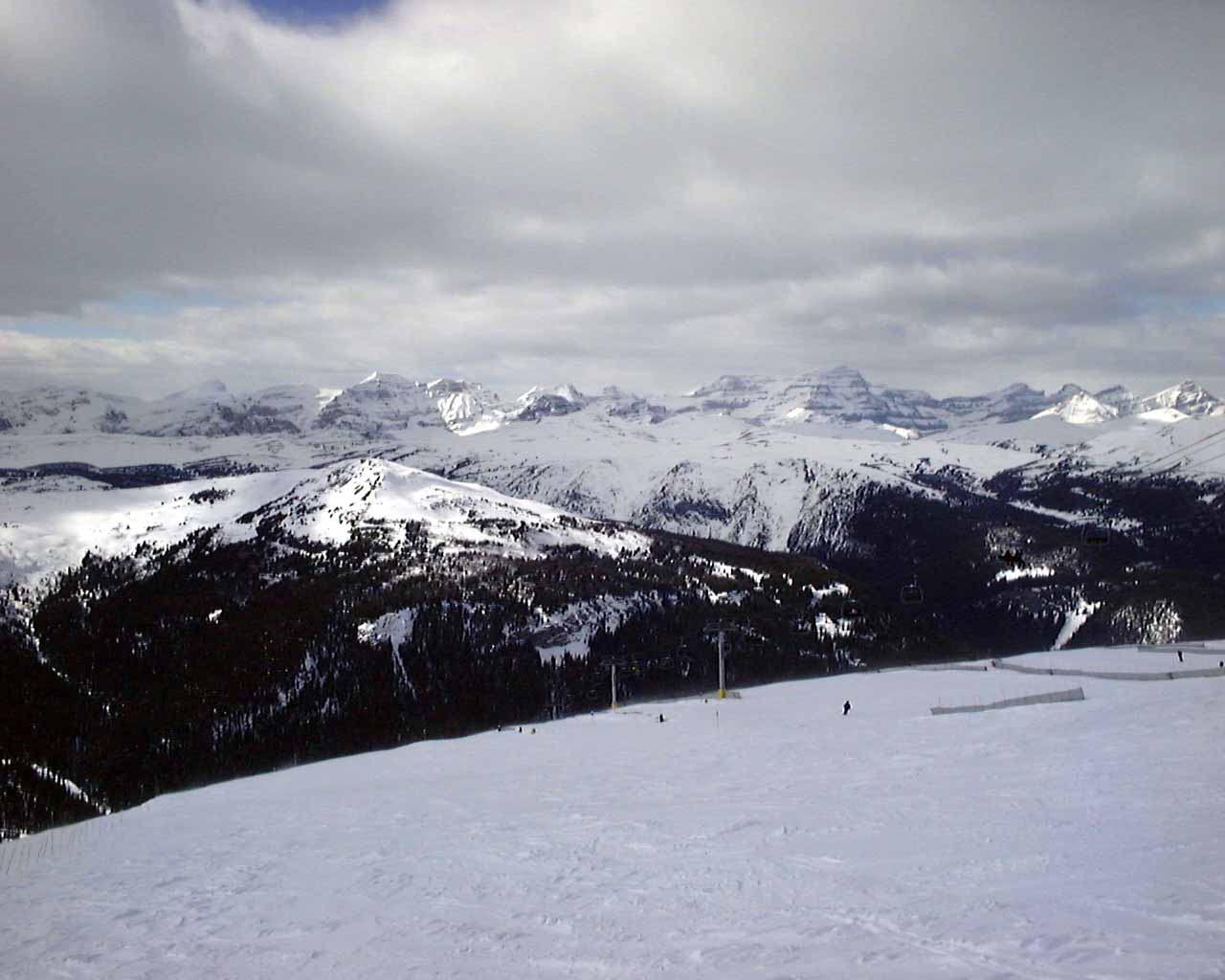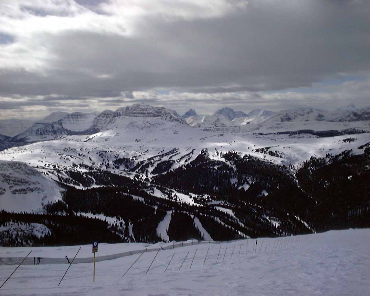 More mountains, and in the valley a good view of the center of Sunshine Village.