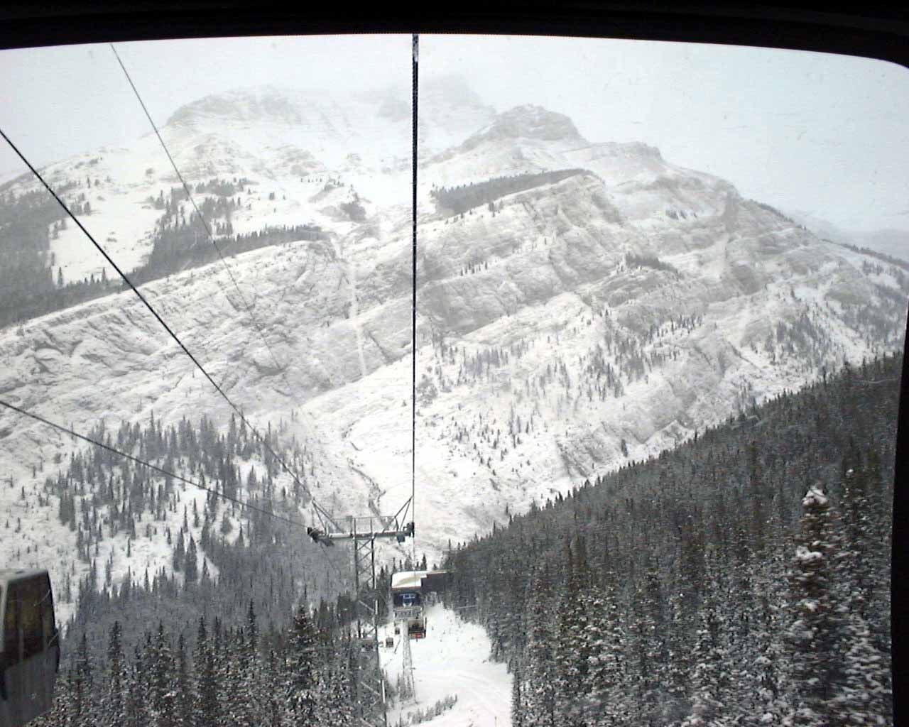 Still on the gondola, big huge flat mountain in background, and that is one of the "L" sections where the gondola goes around a corner near the bottom of the picture.