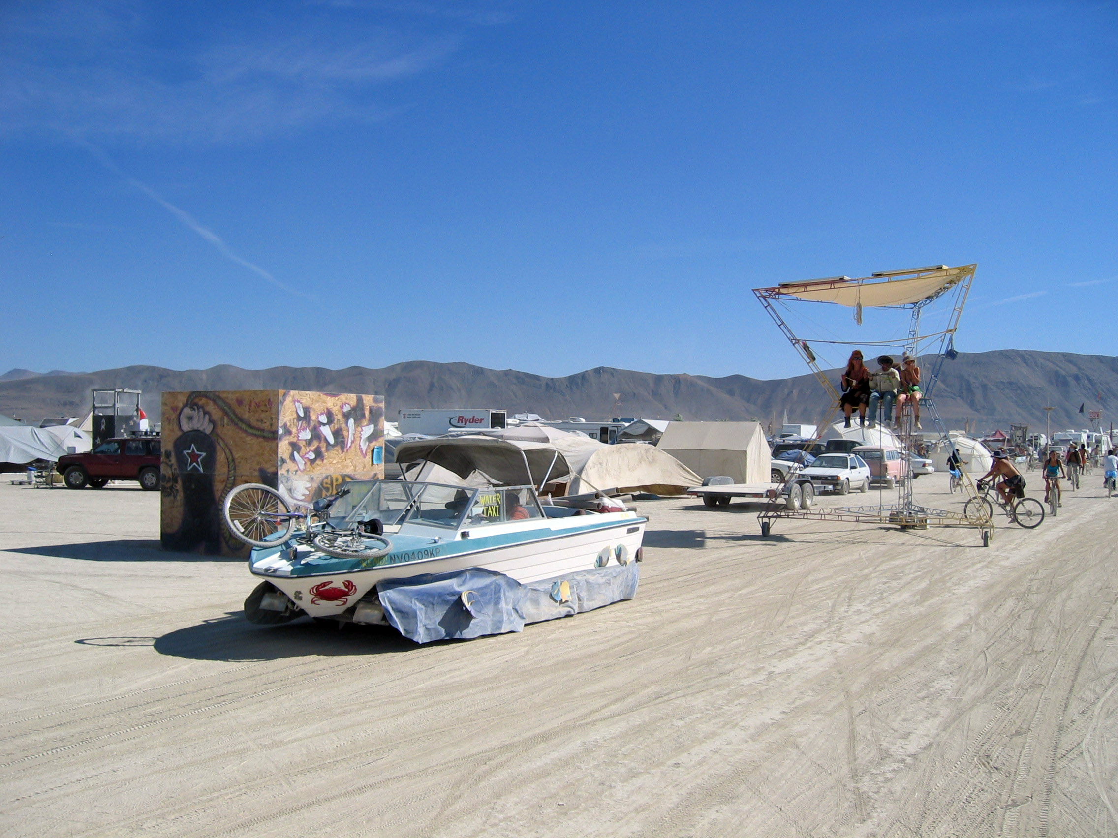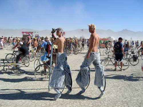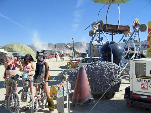 To the right of center in the photo is a "brain" art car. On the left notice the woman are wearing high boots with big 1960s looking fake fur. These were VERY popular on attractive woman at Burning Man, which really bothers me. I don't like the idea that there are "style trends for attractive hip people" forming at Burning Man, it is SUPPOSED to be about being artsy and wacky, not "fitting into the fashion forward style trends". Next year I'll probably hear somebody remark "Did you see those furry boots that person was wearing? That is soooo 'last year' it is embarrassing."