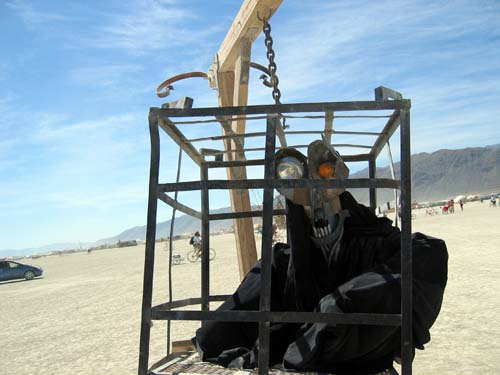 That's a black crow hanging in a box. Not sure what the point here is, this was *WAAAY* out in the playa.