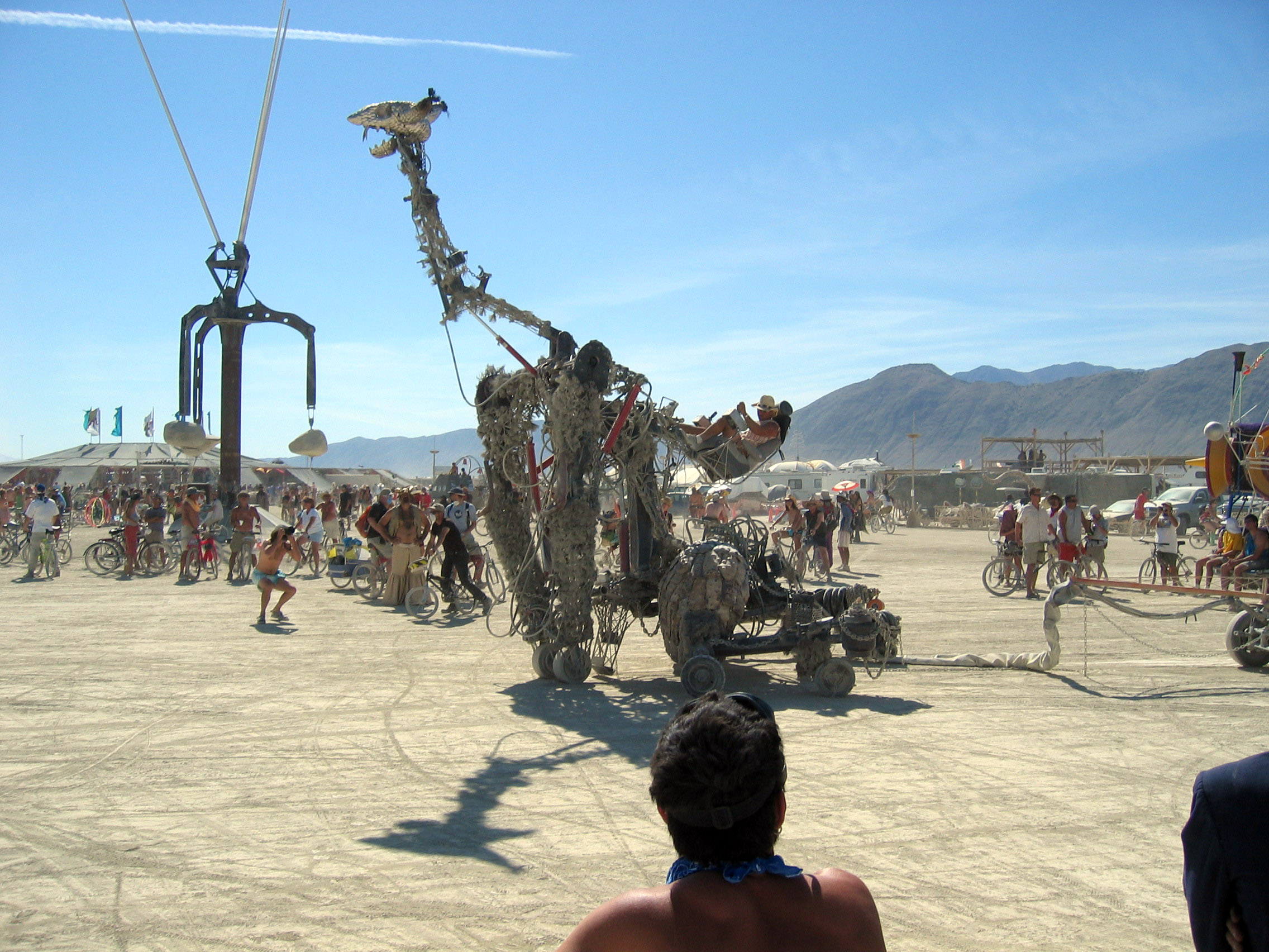 A little way away, in the "playa" (the main open space in the center of Black Rock City), you run into all sorts of crazy "art cars" that are driving around. People put an ENORMOUS amount of effort into some of these, the one below is a walking, fire breathing giraffe that spits fire at night. There is a guy perched on it's back controlling it, it can move up and down and side to side, and actually walks with independent legs across the desert.