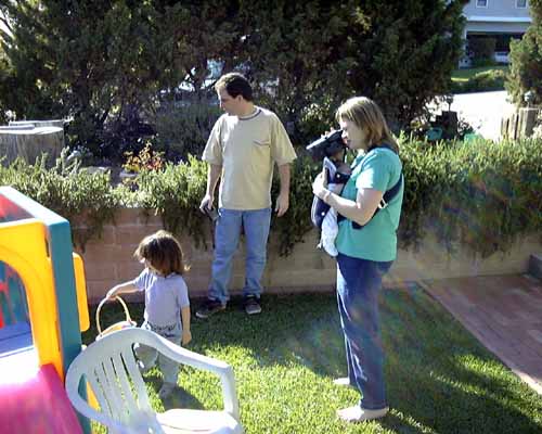 Here is Lauren searching for Easter Eggs in their front yard, Jim, and Judy with the camcorder and with the 7 week old Taylor around her neck: